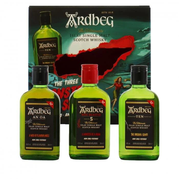 A fabulous pack of three top-drawer Ardbeg drams. The set includes Ardbeg Ten Year Old, Ardbeg Five Year Old Wee Beastie, and Ardbeg An Oa. Each of these bottles feature a hidden artwork hiding behind the label. Peel it off to see what spooky spectacle is awaiting.